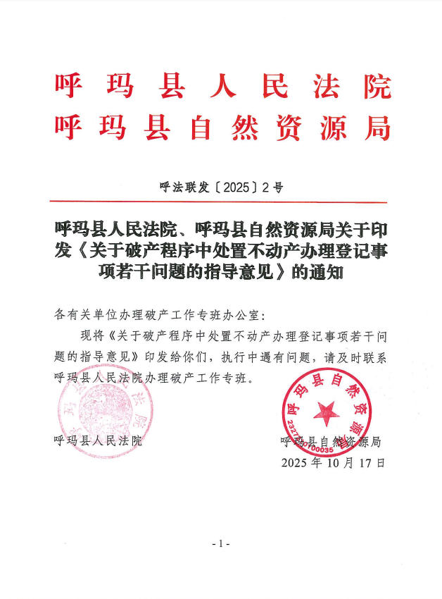 呼玛县人民法院、呼玛县自然资源局关于印发《关于破产程序中处置不动产办理登记事项若干问题的指导意见》的通知