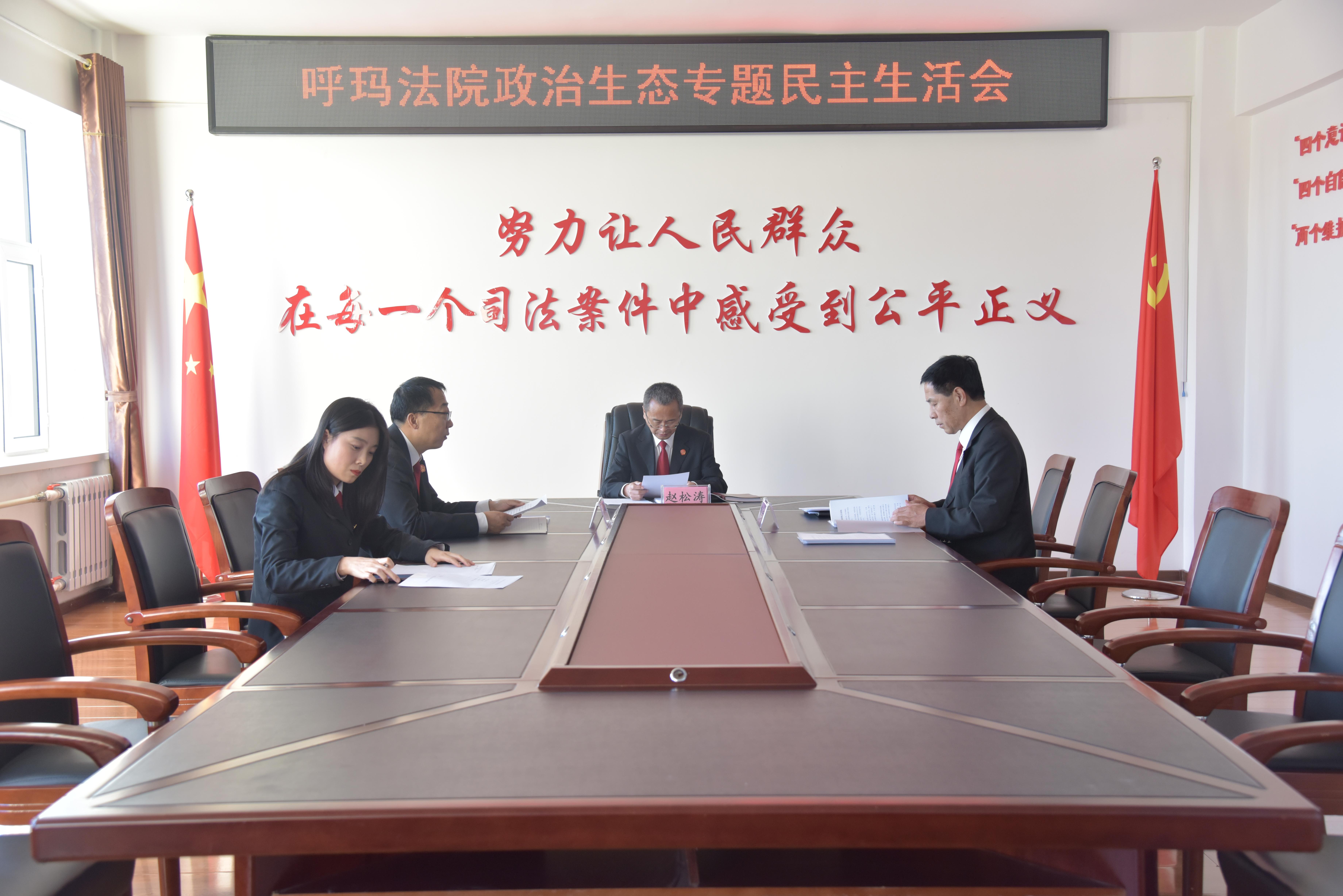 为深入学习贯彻习近平新时代中国特色社会主义思想,充分发挥全面从严治党引领保障作用,推动建设法院风清气正的政治生态。11月30日,呼玛县人民法院党组按照县委组织部要求,经请示县纪委和县委组织部同意,召开政治生态建设专题民主生活会。